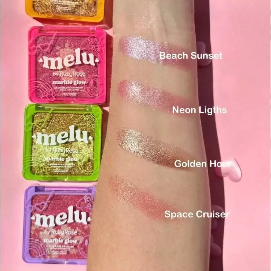 luminador cremoso. Ruby Rose Melu Marble Glow Beach Sunset cria um efeito de mármore deslumbrante com alta pigmentação e um brilho molhado.